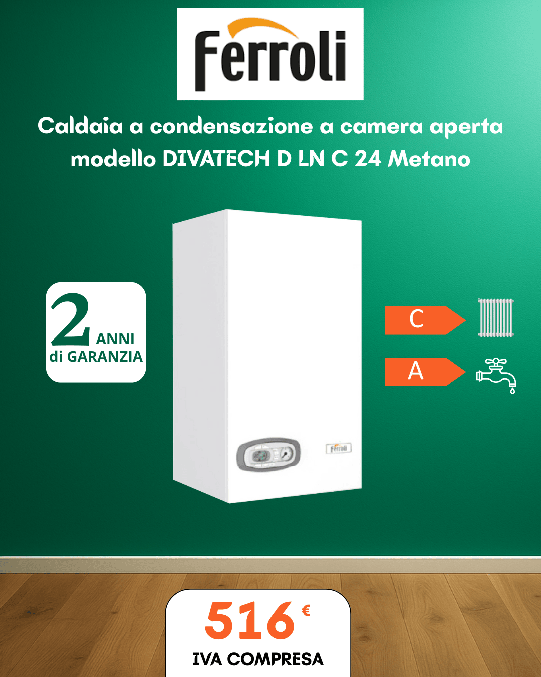 FINANZIAMENTO A TASSO ZEROCaldaia Ferroli Divatech D LN C 24 Metano – Murale, Camera Aperta, Low NOx